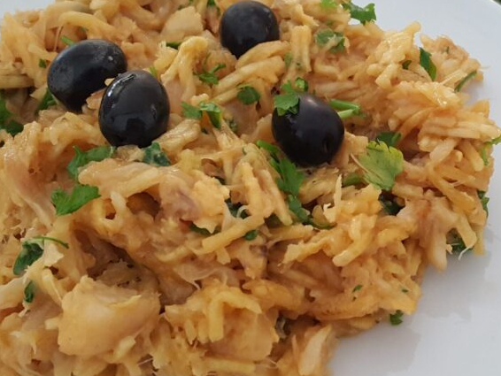 Coza o bacalhau, retire peles e espinhas e lasque-o em tiras finas. Reserve.