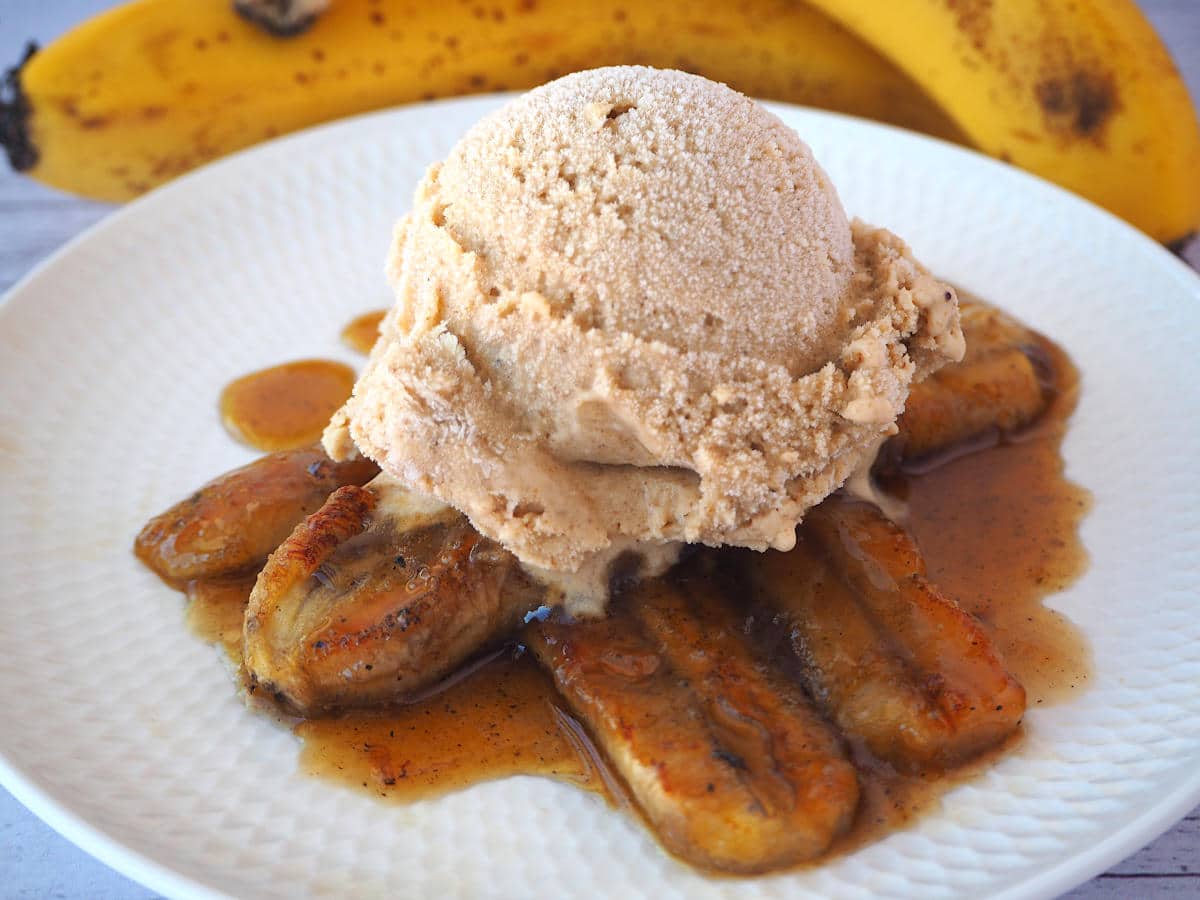 As bananas caramelizadas com canela e gelado ficam macias e perfumadas. O contraste com o gelado frio transforma esta sobremesa simples numa pequena indulgência que parece saída de um restaurante.