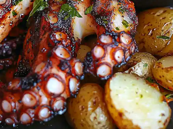 • Disponha por cima os tentáculos e pedaços do polvo cozido.